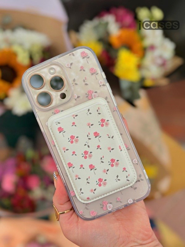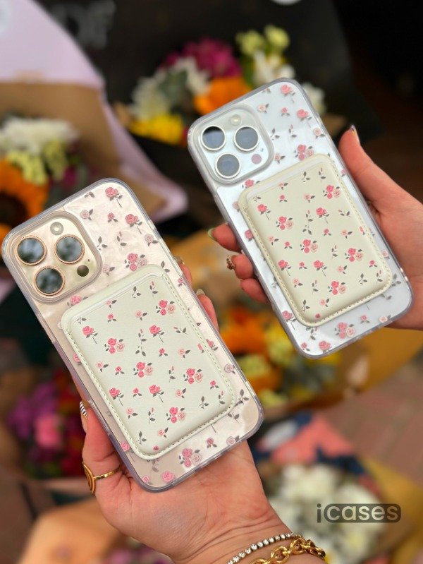 Delicadeza en cada detalle: funda transparente con MagSafe y diseño floral, acompañada de una wallet a juego en tonos cremita. Protegé tu teléfono con estilo y llevá tu esencia florecida a todos lados